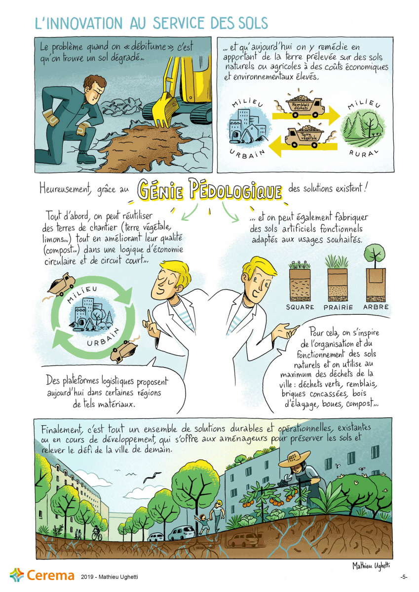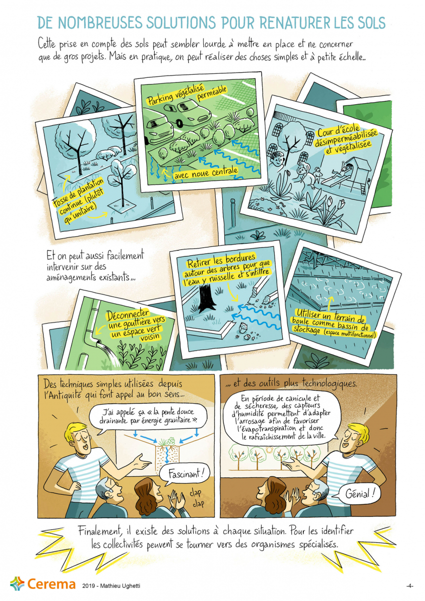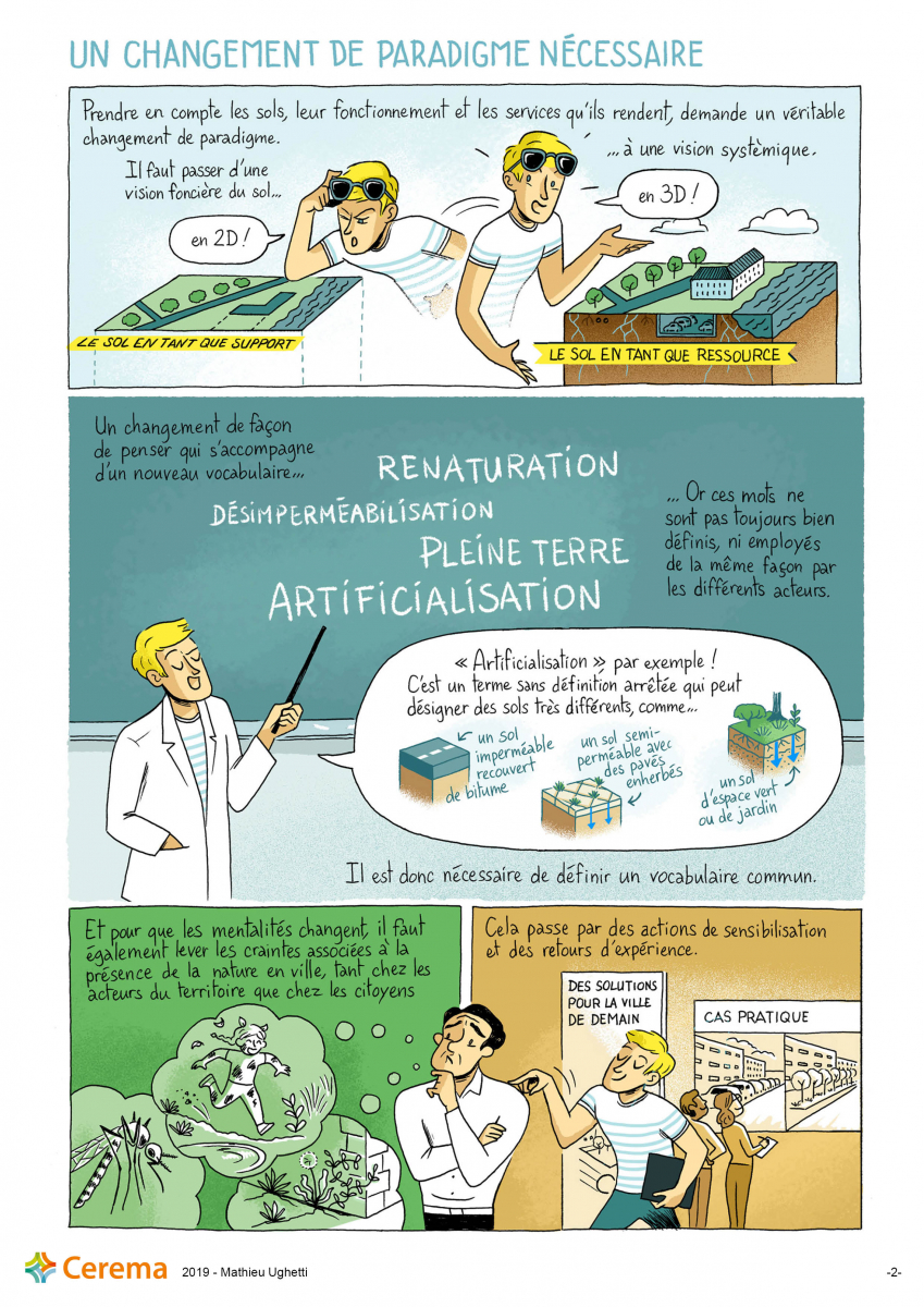 Fruit d’une collaboration avec un illustrateur – Mathieu Ughetti –, la BD synthétise les principaux messages à retenir de cette journée d’échanges organisée par le Cerema Ile-de-France à destination des collectivités le mardi 08 octobre 2019 à La Défense.