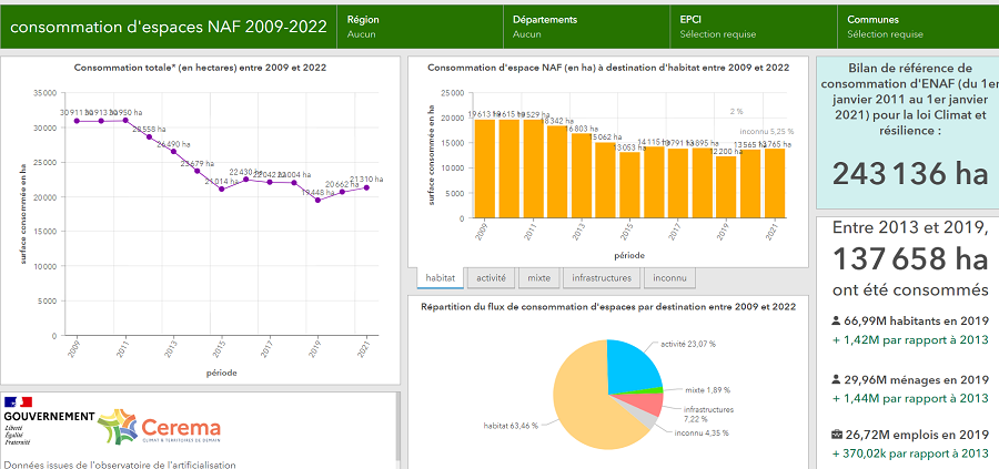 Des outils d'aide à la visualisation et à l'analyse de ces données sont aussi proposés, via un tableau de bord interactif et la publication d'indicateurs pré-calculés qui permettent d'observer l'évolution de l'artificialisation entre le 1er janvier 2009 et le 1er janvier 2024 à plusieurs échelles territoriales.