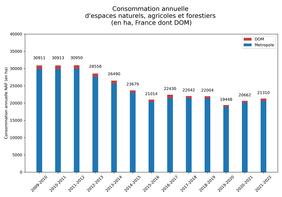 19 263 hectares ont été artificialisés en 2023, chiffre le plus bas depuis le lancement de cette étude en 2009, inscrivant dans la durée la baisse de la consommation foncière depuis 2021. 63% de cette artificialisation est destinée à l'habitat, 23% à l'activité.