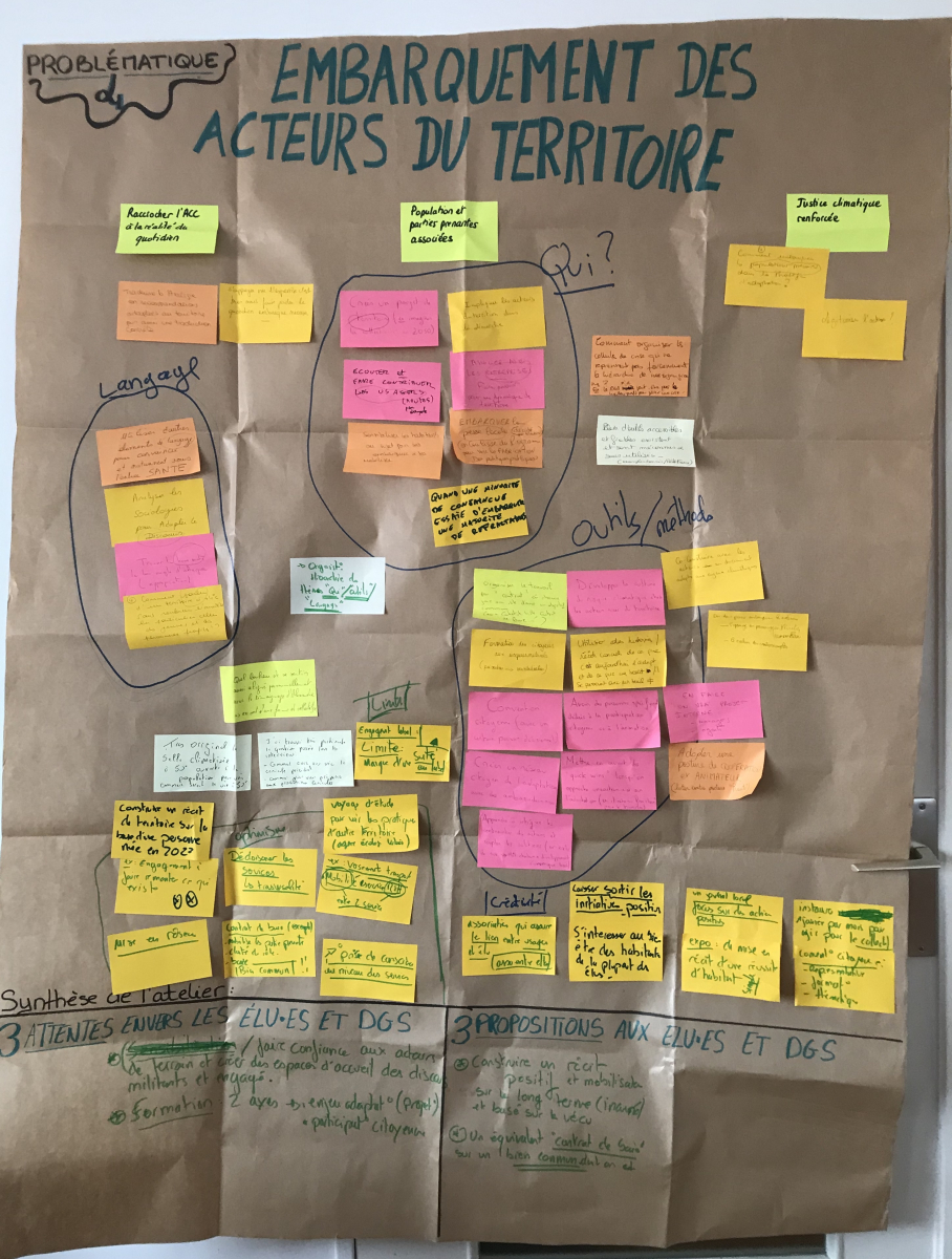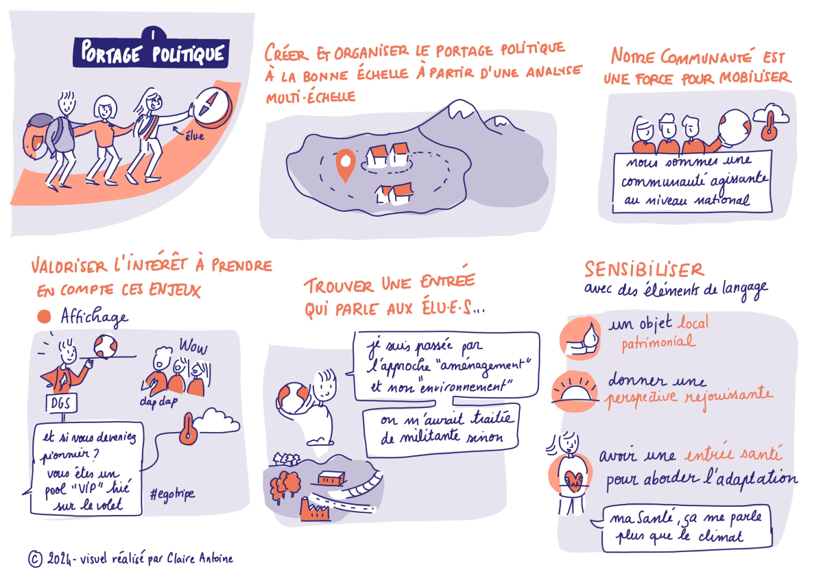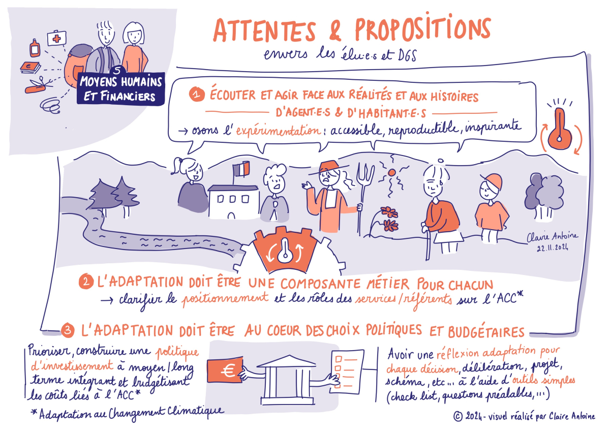 “Nous devons revoir nos éléments de langage. […] Il est important de trouver les bons termes pour les élus, nous devons passer d’un sujet pour les spécialistes à un sujet concret pour tout le monde, c’est-à-dire rendre accessible les enjeux d’adaptation en démystifiant le côté scientifique.", explique ce participant. Une autre : "Tous les élus ne sont pas sensibles à la dimension écologique. En revanche, ils accrocheront si on leur parle de protéger leur population. Pour nous agents, s’inspirer de ces pratiques est un changement de culture et de méthode."