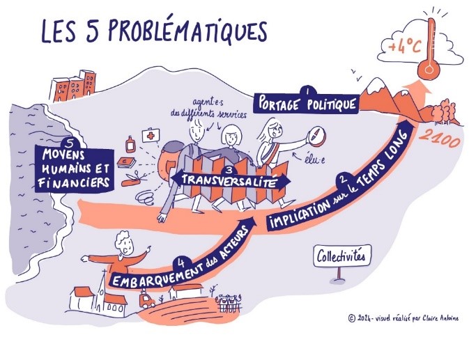Embarquer les acteurs, à chacune des étapes de la démarche d’adaptation : parler du changement climatique avec lucidité dans le territoire, écouter et embarquer toutes les forces vives du territoire pour co-construire une vision partagée puis un plan d’action, dans lequel chacun aura un rôle à jouer… Il s’agit de parvenir à embarquer à tous les niveaux : en interne, les élus et les services, sur le territoire (tous les EPCI, toutes les communes), et plus largement, les citoyens et citoyennes, acteurs socio-économiques, l’État.