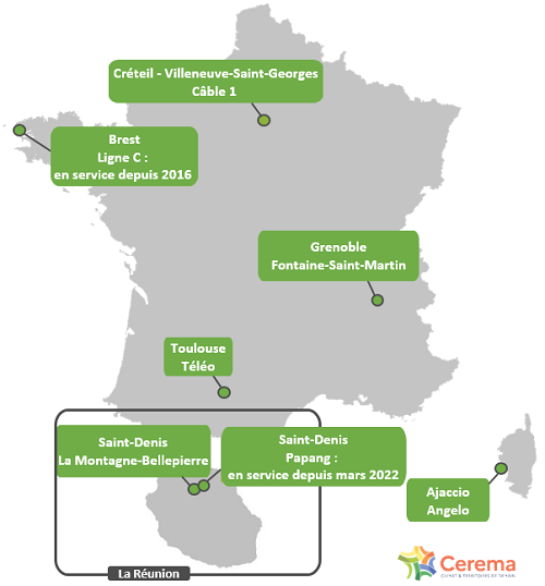 La synthèse de l'étude s'appuie sur les retours d'expériences des lignes de transport par câble de Brest (en service depuis 6 ans), de Saint-Denis de la Réunion (ligne Papang inaugurée le 15 mars 2022) ainsi que sur les retours d'expériences de 5 projets de transport par câble aérien en milieu urbain, qui sont à l'étude, en travaux ou phase d'essais (ci-dessous sur la carte).