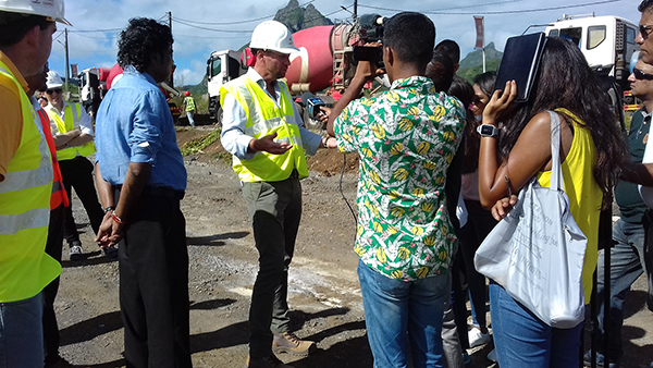 La dernière mission réalisée par les spécialistes en mécanique des sols du Cerema a conduit à une rencontre avec M. Nando Bodha, ministre des infrastructures publiques le samedi 2 février 2019 sur le chantier en présence de la presse et des deux contracteurs (Transinvest et Sinohydro).
