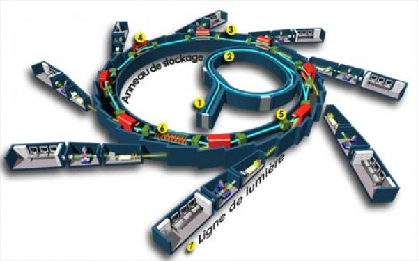 Le rayonnement synchrotron est une lumière émise par des électrons circulant à une vitesse proche de celle de la lumière dans le vide, de très haute énergie (énergie nominale de SOLEIL de 2,75 GeV) qui tournent dans un anneau de stockage de 354 m de circonférence. Il est émis sous forme d’un faisceau extrêmement fin, tangentiellement à la trajectoire des électrons, lorsque celle-ci est courbée par un champ magnétique (force de Lorentz).