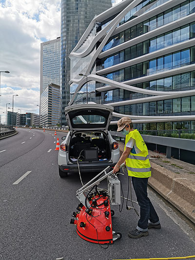Valérie Muzet réalise des mesures avec l’appareil COLUROUTE, sur le périphérique de la Défense à Paris.