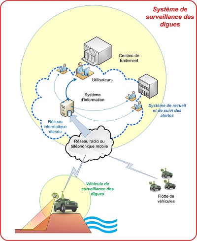 Sous la maitrise d’ouvrage de la DREAL Centre et de la DDT du Loiret, ce projet a pour objectif de développer un système de surveillance des digues en période de crise. En période de crise (crue de la Loire), le plan de surveillance de la Loire prévoit le patrouillage des tronçons de digues à risques, en continu pendant toute la durée de la crue (parfois plusieurs jours) en vue de détecter des désordres éventuels (fuite d’eau, brèche, etc).