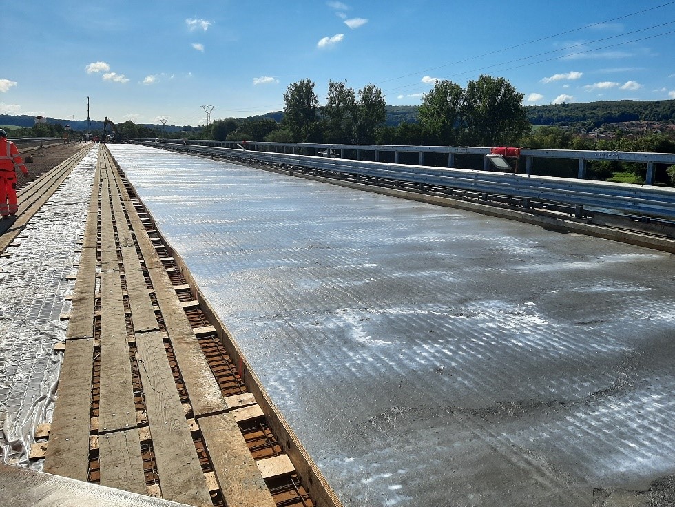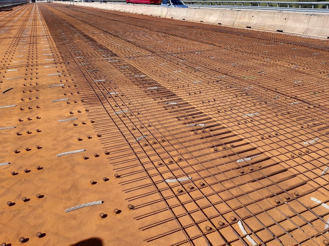 En septembre 2024 puis en juin 2025, lors de 4 week-ends de coupures totales, il a été réalisé sur le platelage métallique une dalle en BFUP (Béton Fibré Ultra Performant) de 5 centimètres d’épaisseur. Cette dalle a été coulée après une fabrication foraine à l’aide de deux centrales de production et d’un malaxeur placés préalablement aux abouts de l’ouvrage. Il avait été nécessaire, préalablement au coulage du béton, de souder environ 90 000 connecteurs sur la tôle de platelage pour s’assurer d’une parfaite connexion entre la dalle en BFUP et la dalle orthotrope.