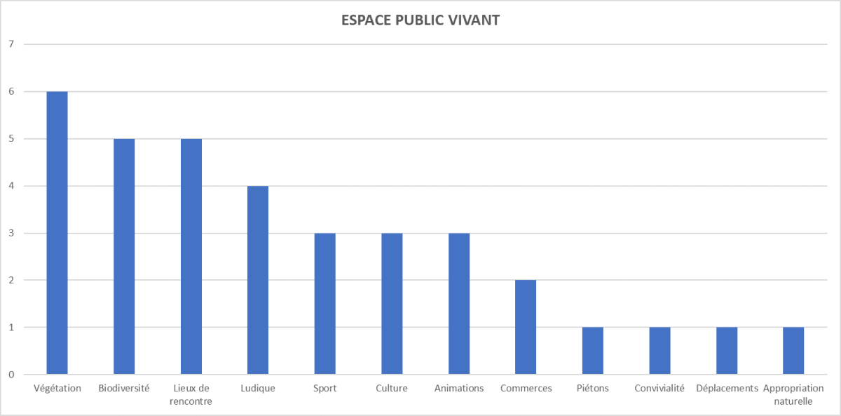 C’est ainsi que de nombreuses thématiques ont été abordées, de la nature à la mobilité, de la gestion des déchets à la vitalité commerciale, en passant par le sentiment de sécurité sur les espaces publics, ou encore la présence de toilettes et de point d’eau potable.