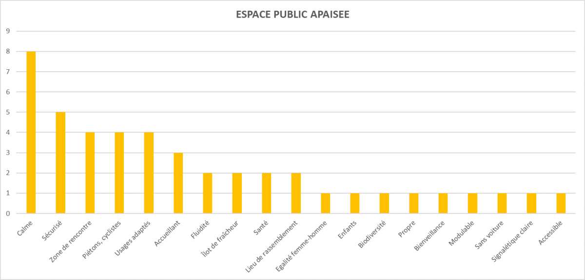 | Positif | Convivialité (présence de familles, facilité des échanges) Absence de bruits motorisés / fermé aux voitures Ambiance piétonne Mobilier urbain urbain permettant de se poser / reposant Eclairé / mis en lumière Présence de la nature / d'arbres Circulation apaisée Absence de bruit tard le soir (si terrasse) Ambiance "village" Bruits apaisants (fontaine) | Fermeture de l'accès voitures / Espace piétonnier Espace ouvert Espace fermé à l'aide de grilles Bonne visibilité sur l'ensemble de l'espace public Bonne lisibilité de l'espace public Limitation des vitesses Animé Circulation à pied aisée | Mixité d'usage Présence de familles Favorise les échanges Animé (en lien avec la sécurité) | Espace aéré Espace végétalisé Favorise l'activité physique et la pratique sportive Ombragé Espace convivial Relations sociales Pratique de la marche et du vélo Point d'eau Lieux de repos (bancs) Lieu de bien-être | Facile d'accès / espace public perméable Respect des normes d'accessibilité de l'espace public Espace plat Présence de bancs et mobilier de repos Espace public simple et lisible Espace public accessible à tous et accueillant de nombreux usages Stationnement PMR Espace mixte piéton/ voiture / facilité d'accès pour tous. |