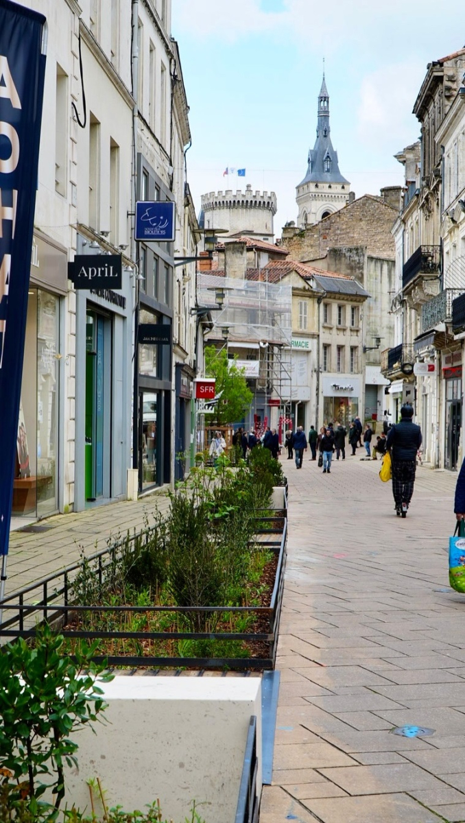 Végétalisation d'une rue piétonne / Ville d'Angoulême Une mixité d’usages : présence de familles, mixité par la pratique de loisirs, mise en valeur du paysage, de l’activité économique, des commerces de proximité, de la culture et valorisation du patrimoine, proposition de différentes offres de mobilités, lieux de repos, lieux de fraîcheur, etc.