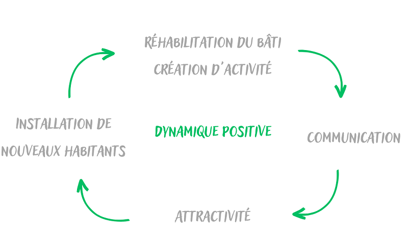 Les actions mises en place s’inscrivent dans 4 orientations principales qui ont progressivement émergé de ces ateliers et dont le but est de générer une dynamique positive en capacité d’enrayer la perte d’attractivité et de dynamisme observée sur le territoire :