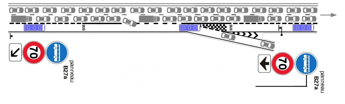Impliquant des contraintes d'exploitation garantissant la sécurité de l'infrastructure : trafic inférieur à 100 bus à l'heure, vitesse limite à 70 km/h, porté à connaissance de règles d'usage