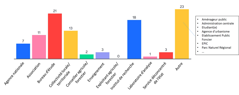 Les participants au webinaire couvrent différents secteurs d’activités. Les bureaux d’études, les instituts de recherche, les collectivités, les associations et les agences nationales étant les plus représentés.
