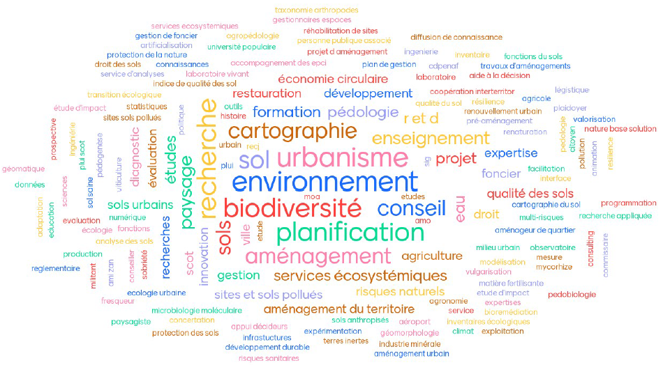 Lorsqu’ils s’expriment sur leurs activités les mots clefs qui ressortent du nuage de mot sont : Environnement / Biodiversité / Urbanisme / Planification / Cartographie / Recherche / Sol(s) / Aménagement / Conseil / Paysage.