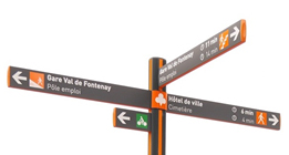 Sur chaque mât de signalisation, on retrouve des informations de direction, de temps de parcours piéton et un QR-Code qui permet d’accéder via son smartphone à des informations complémentaires : plan schématique du parcours, mentions supplémentaires et itinéraires alternatifs. Avec tout cela, plus aucune crainte de se perdre !