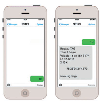 Pour obtenir ce ticket dématérialisé, l’usager envoie un SMS avec le mot-clé « 1H » au 93 123. Il reçoit par retour un titre de transport valable 1 heure, y compris en correspondance, sur l’ensemble du réseau TAG de l’agglomération grenobloise (hors lignes Transisère et TER). Le montant du ticket est directement prélevé sur la facture de son opérateur mobile**.