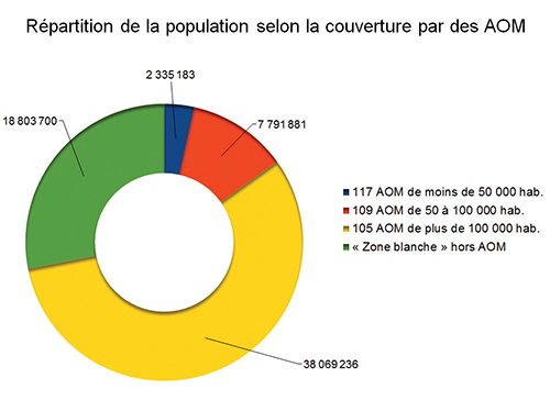Si les 330 AOM françaises couvrent près des trois quarts de la population, elles ne représentent en superficie que 25 % du territoire. Elles sont en effet constituées autour des centres urbains, là où les enjeux de mobilité sont les plus marqués. Les principaux outils de planification (le plan de déplacement urbain) et de financement (le versement transport) à leur disposition sont d’ailleurs construits pour ce type de territoires. Ce choix historique se conçoit au regard du poids prépondérant des grandes AOM en termes de population.