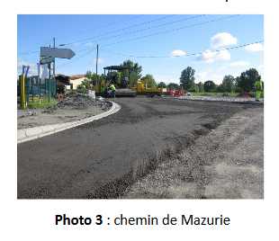 La deuxième expérimentation a été conduite à partir de juillet 2010 sur le chemin de Mazurie dans le cadre de la réhabilitation de la voirie du parc d’activités de Lacourtensourt (communes d’Aucamville et de Fenouillet, métropole de Toulouse). Une planche de référence en GB3 et une planche d’Ecomix Structure, toutes deux en 14cm d’épaisseur, recouvertes par un BBME 0/10 en 6cm d’épaisseur, sur une plate-forme PF2, ont été soumises à un trafic T5 de 20 PL/j/sens environ. Le suivi à quatre ans a montré un bon comportement des planches expérimentales, malgré la présence de nom-breux regards et d’une tranchée pour intervention sur réseau qui ont altéré l’intégrité des structures expérimentales. Des essais de modules réalisés sur deux éprouvettes de tenue médiocre découpées en avril 2012 dans des carottes prélevées sur site ont conduit à des valeurs à 15°C et 0,02s de 2 800 MPa et 5200 MPa pour des teneurs en vides respectives de 16,4 et 14,8%.