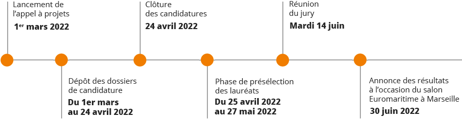 Dates indicatives, susceptibles de modifications de la part des Organisateurs. Les structures candidates doivent se tenir informées en consultant régulièrement la page web de l’appel à projets.