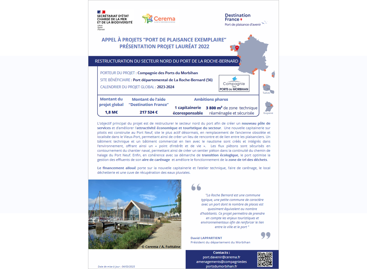 - Le dispositif d’appel à projets, organisé en deux sessions en 2022 et 2023, a permis de subventionner les projets d’aménagement, de modernisation et d’adaptation d’un port de plaisance répondant au mieux aux objectifs fixés par le plan Destination France, à savoir :