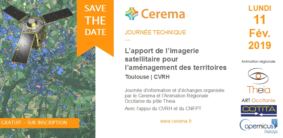 Le Cerema Sud-Ouest organise le lundi 11 février 2019 une journée d'information et d'échanges sur l'apport de l'imagerie satellitaire pour l'aménagement des territoires dans le cadre des animations THEIA et COPERNICUS pour l'aspect spatial et COTITA pour l'aspect métier.