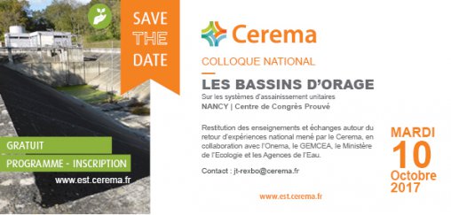Le mardi 10 octobre 2017 au Centre de Congrès Prouvé de Nancy, le Cerema organise un colloque national exceptionnel autour de la thématique des bassins d’orage, appliquée aux systèmes d’assainissement unitaires.