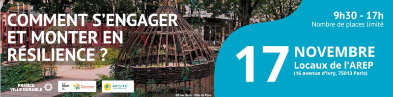 Dans le cadre des travaux sur l'état des lieux et les perspectives de déploiement des politiques de résilience dans les collectivités locales françaises , le Cerema en partenariat avec France Ville et Territoires Durables et avec l’appui du cabinet Aristot a le plaisir de vous convier le 17 novembre 2023 à une journée de partages et d’ateliers collectifs autour des bonnes pratiques, outils et méthodes pour monter en résilience dans nos territoires.