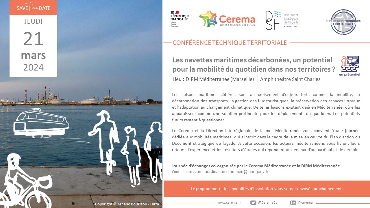 Le Cerema et la Direction Interrégionale de la mer Méditerranée vous convient à une journée dédiée aux mobilités maritimes, qui s’inscrit dans le cadre de la mise en œuvre du Plan d’action du Document stratégique de façade. A cette occasion, les acteurs méditerranéens vous livrent leurs retours d'expérience et les résultats d'études qui répondent aux enjeux d’aujourd’hui et de demain.