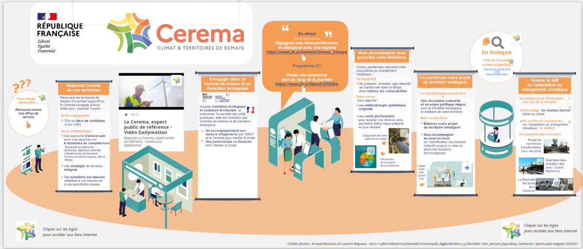 Des mini-conférences animées par nos experts permettront d'aborder des sujets clés comme l'adaptation au changement climatique, la résilience des territoires ou encore les stratégies de mobilité et aux acteurs des territoires de dialoguer en direct avec eux.