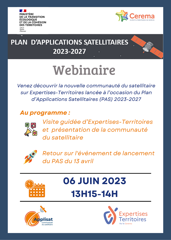 Dans le cadre du nouveau Plan d'Application Satellitaire lancé le 13 avril dernier, le pôle satellite du Cerema et le CGDD au Ministère de la Transition Ecologique et de la Cohésion des Territoires vous invitent à rejoindre la communauté Applisat sur la plateforme Expertises.Territoires.