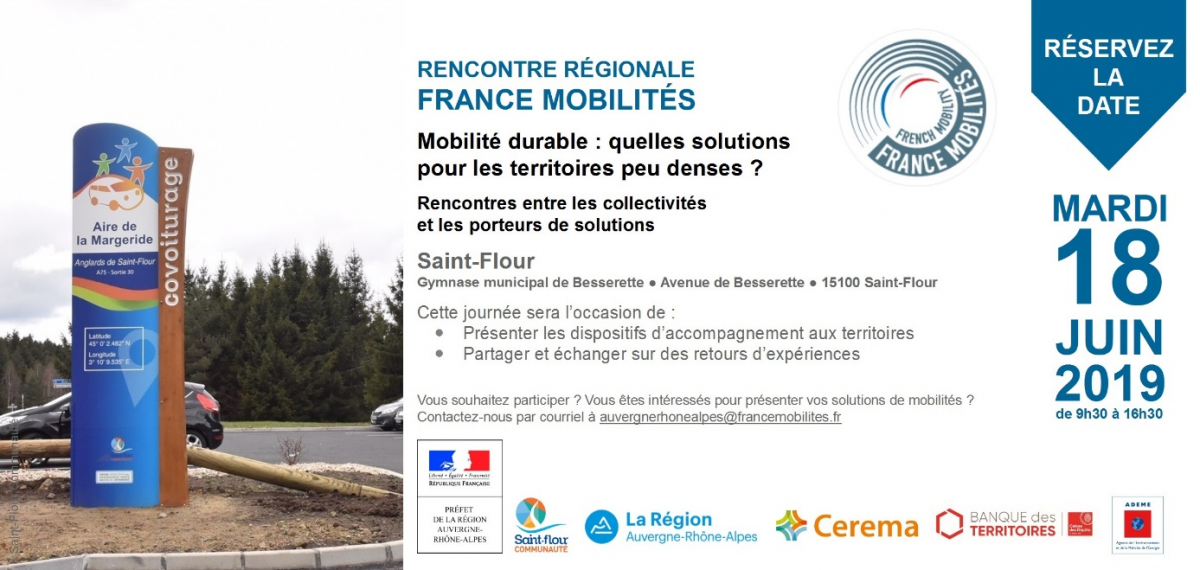 Le Ministère des transports a lancé la démarche France Mobilités qui vise à favoriser l’innovation dans les mobilités, pour tous et dans tous les territoires. Cette démarche se décline dans les territoires, avec l’organisation de rencontres régionales. En Auvergne-Rhône-Alpes, la première rencontre France Mobilités est organisée à Saint-Flour le 18 juin 2019.
