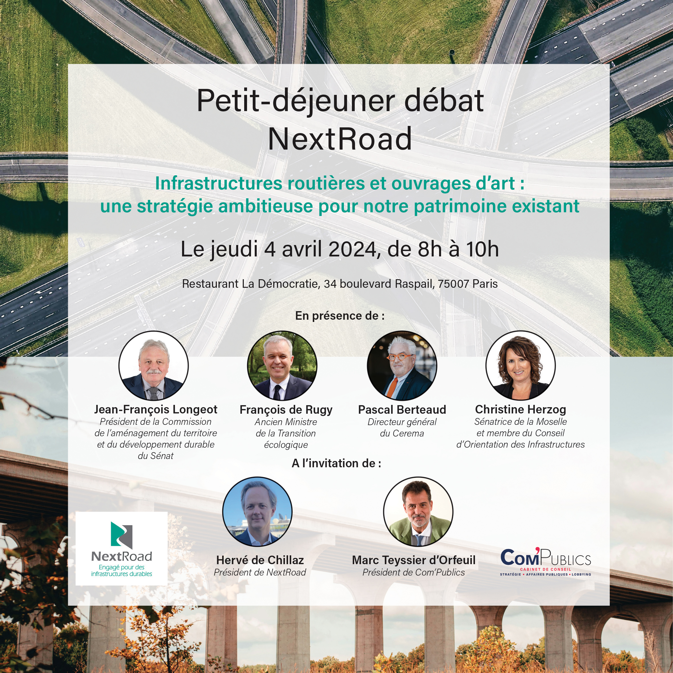 La société NextRoad vous invite à son petit-déjeuner débat le jeudi 4 avril prochain consacré à nos infrastructures routières et ouvrages d'art en présence de :