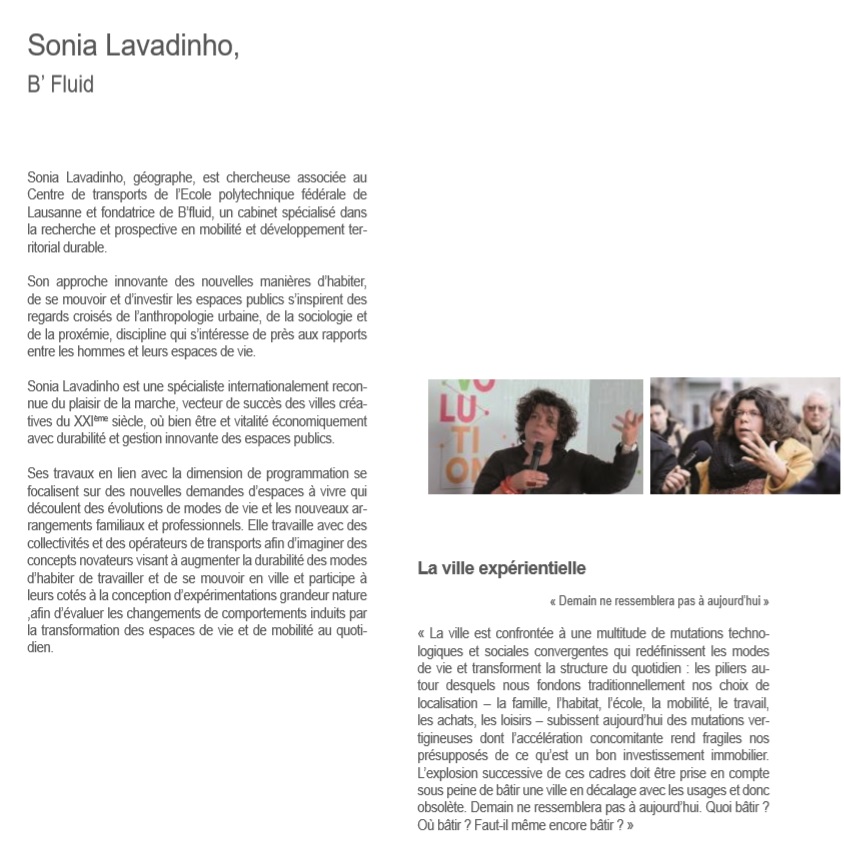 Pour mettre en pratique la ville attractive du dehors, créative, ludique, amie des familles et frugale, des réponses innovantes se dessinent ici ou là : - Adopter des styles de vie, mettant à contribution l’énergie de notre propre corps plutôt que des énergies fossiles pour nos déplacements quotidiens, est une évolution désirable : bonne pour la santé de chacun et pour l’environnement, elle induit des villes qui renforcent le lien social et la cohésion intergénérationnelle : c’est l’invitation donnée par Sonia Lavadinho anthropologue urbaine (B Fluid), - Adopter des modes de faire plus économes en matière, en énergie, en technicité, c’est le pari du manifeste de professionnels du cadre de vie pour une frugalité heureuse. Avec l’appui de Sonia Lavadinho, grand témoin, la rencontre-débat du jeudi 15 novembre prochain à Valenciennes nous invite à débattre des leviers pour élaborer des stratégies spatiales et frugales visant le bien-être public en ville.