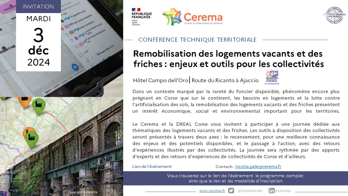 Le Cerema et la DREAL Corse vous invitent à participer à une journée dédiée aux thématiques des logements vacants et des friches. Les outils à disposition des collectivités seront présentés à travers deux axes : le recensement, pour une meilleure connaissance des enjeux et des potentiels disponibles, et le passage à l'action, avec des retours d'expériences illustrés par des collectivités. La journée sera rythmée par des apports d'experts et des retours d'expériences de collectivités de Corse et d'ailleurs.