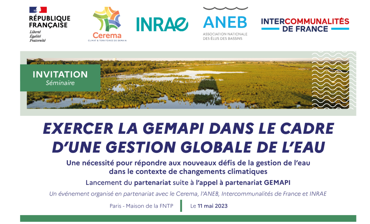 Le Cerema, l'Association Nationale des Élus de Bassin, Intercommunalités de France et l'INRAE, organisent le jeudi 11 mai 2023, un séminaire : "Exercer la GEMAPI dans le cadre d’une gestion globale de l’eau - Une nécessité pour répondre aux nouveaux défis de la gestion de l’eau dans le contexte de changements climatiques".
