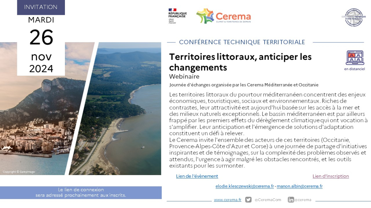 Le Cerema invite l'ensemble des acteurs de ces territoires (Occitanie, Provence-Alpes-Côte d'Azur et Corse) à une journée de partage d'initiatives inspirantes et de témoignages, sur la complexité des problèmes observés et attendus, l'urgence à agir malgré les obstacles rencontrés, et les outils existants pour les surmonter.