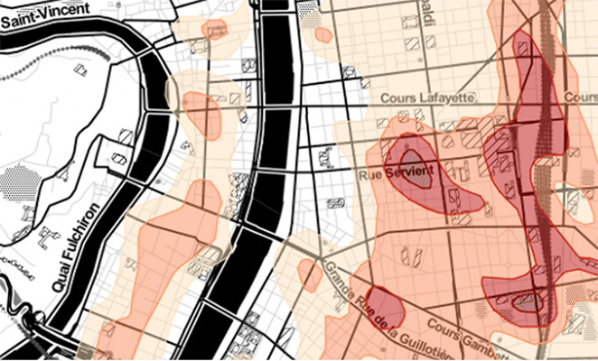 - le réchauffement moyen de la nappe induit par les sources de chaleur anthropiques. Ce réchauffement est particulièrement significatif dans le secteur de la Part-Dieu, sur la presqu’île de Lyon, et dans le 7èmearrondissement, dans l’axe de la ligne de métro B où les écarts à la température de référence peuvent dépasser 4 °C ;