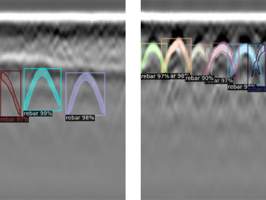 - L’apprentissage d’un modèle pour la segmentation d’instances des armatures a donnée des performances avec une précision moyenne supérieure à 85% (voir figure ci-dessous). A partir de la segmentation des armatures, trois propriétés physiques sont calculées : profondeur des armatures, leur inter-distance et l’amplitude normalisée du signal à mettre en lien avec la qualité du béton. Le lien entre propriétés extraites et état de surface doit encore être approfondi.