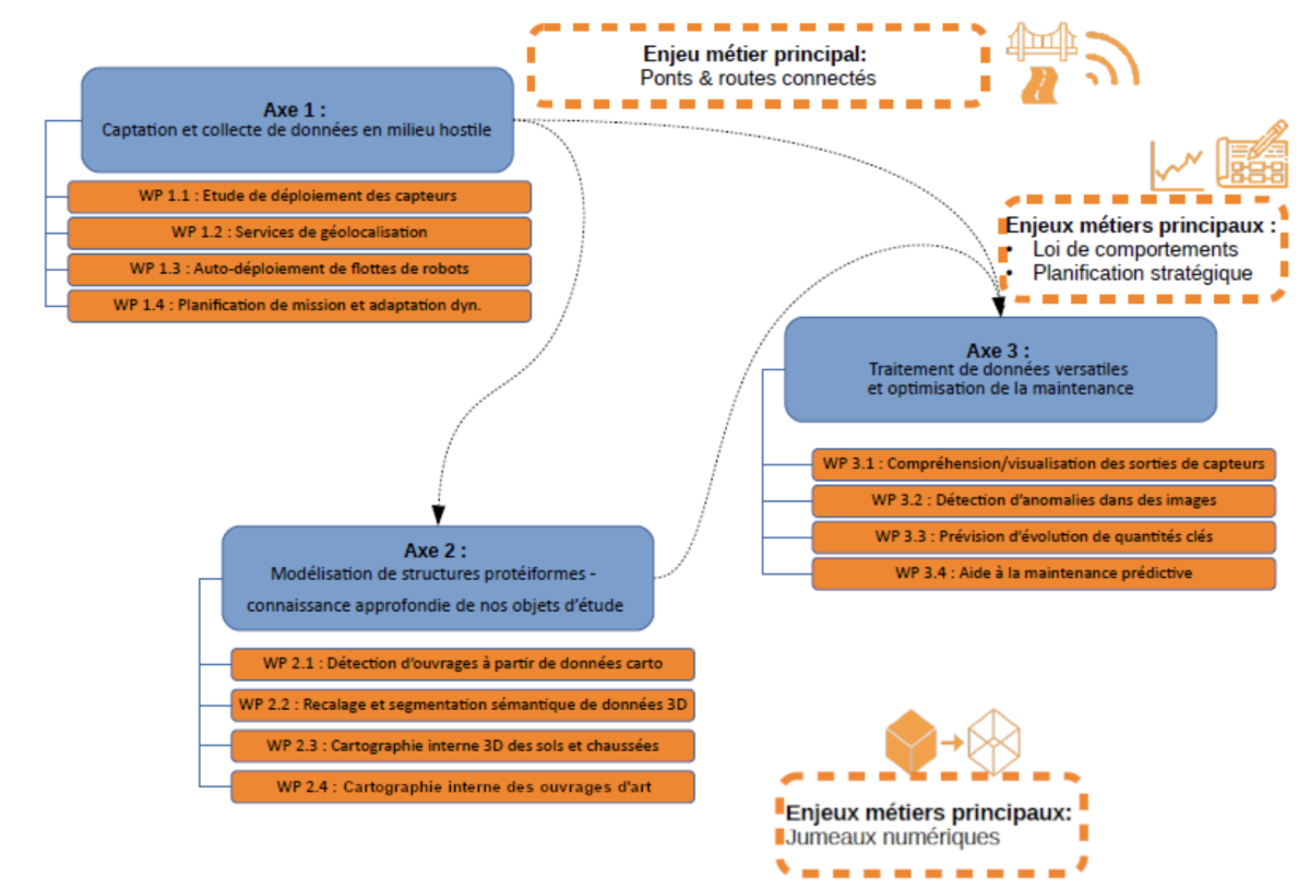 Le Défi vise à prendre en considération les difficultés suivantes : volume et nature des données (hétérogénéité et non complétude, multi-sources…), échelles multiples d’analyse (des sous-systèmes d’un actif au réseau complet national), « prédiction » de comportements très locaux à l’échelle d’un réseau global, complexité des objets routiers – OA et routes – en raison de leur exploitation et des conditions météorologiques, modélisation 3D avec sémantisation, modélisation de connaissances « expertes » (IA « hybride », informations a priori) voire « explicabilité/interprétabilité » des résultats pour garantir l’adhésion des experts métier.