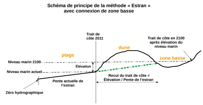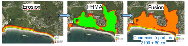 Les zones basses qui se trouveraient connectées du fait de l’érosion ont été déterminées sur la base des plus hautes marées astronomiques (PHMA) à laquelle a été ajoutée l’élévation du niveau marin. La PHMA qui est le plus haut niveau marin hors évènement tempétueux est approché plusieurs fois par an lors des grandes marées et constitue une hypothèse réaliste à prendre en compte.