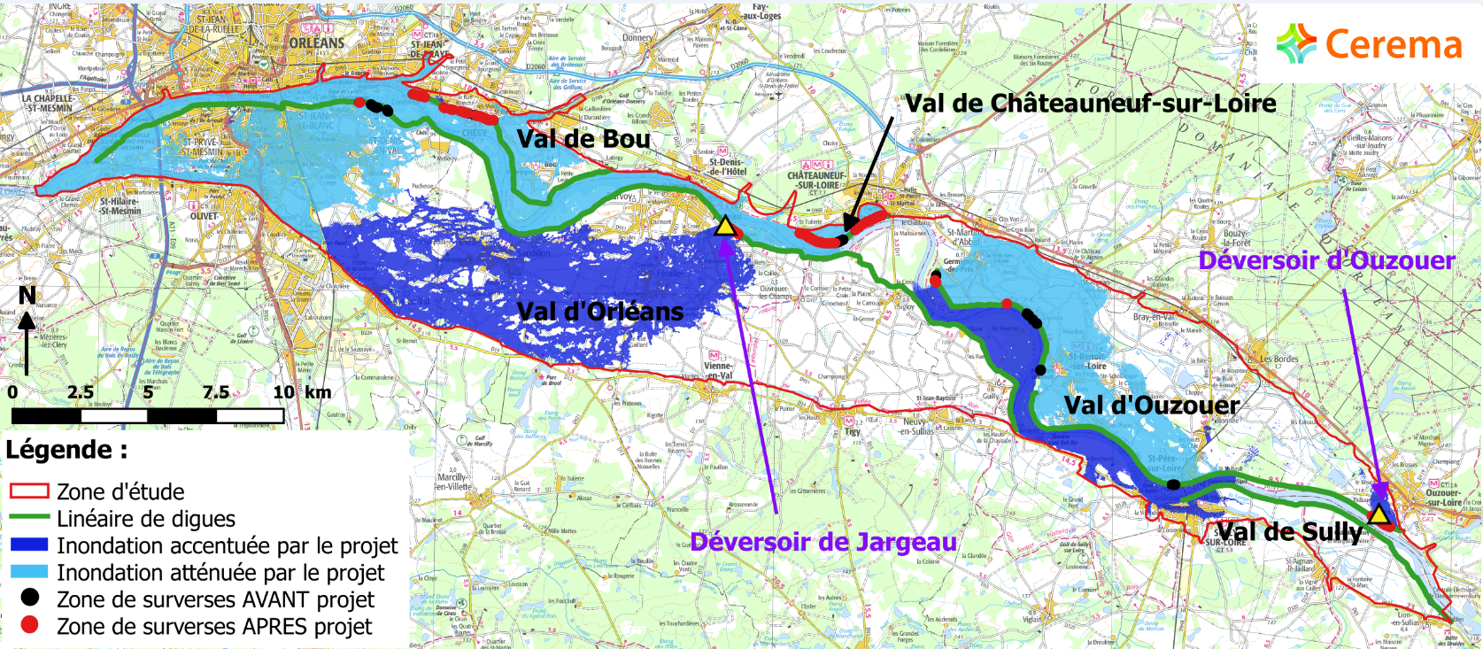 Dans ce cadre, la DREAL Centre-Val de Loire a sollicité le Cerema Normandie-Centre afin de modéliser cette zone pour quantifier et qualifier les impacts des aménagements prévus sur les digues du val d’Orléans.