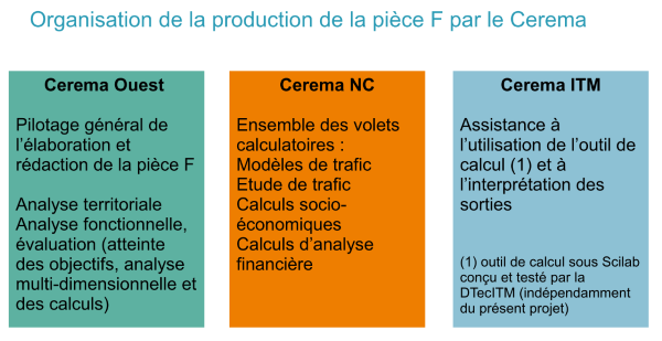 Afin de proposer au maître d’ouvrage une prestation globale et complète, le Cerema a mis en place une équipe-projet ad’hoc, associant des compétences variées : analyse territoriale et évaluation des projets d’infrastructures (CeremaOuest), modélisation des déplacements (CeremaNC) et la conception et le développement d’outils de calcul socio-économique (CeremaITM), sous coordination du Cerema Ouest.