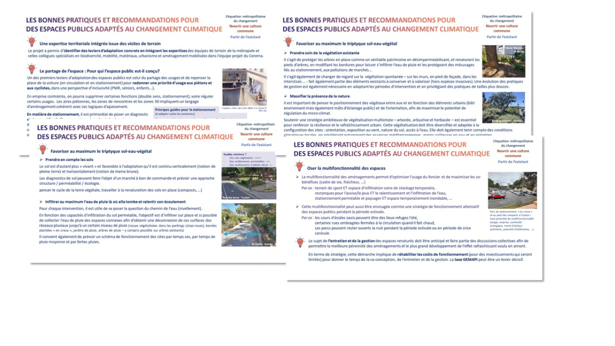 L'immersion physique et l'expérimentation : des visites de terrain et expertises techniques ont été menées à Toulon, La Garde et Hyères. Ce passage par le site a permis de mettre en avant les bonnes pratiques et d'identifier des recommandations à différentes échelles de projet : quartier, îlot et même rue -car l'adaptation des espaces publics de demain passe d'abord par l'adaptation des espaces existants.